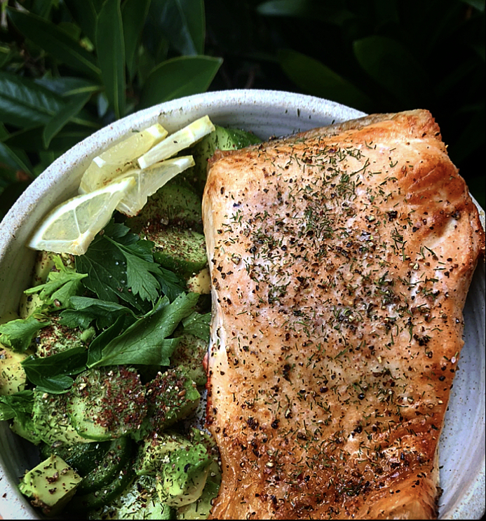 - While that is baking, slice cucumber into thin discs and peel and slice avocado into chunks, alay on each plate and dust with salt, pepper, more dill, sumac and arrange sliced lemon and parsley as an optional garnish