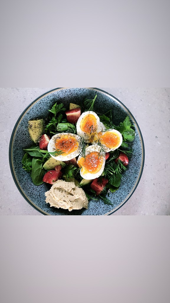 - Cut eggs in half and add to bowl with hummus and all other ingredients. Enjoy!