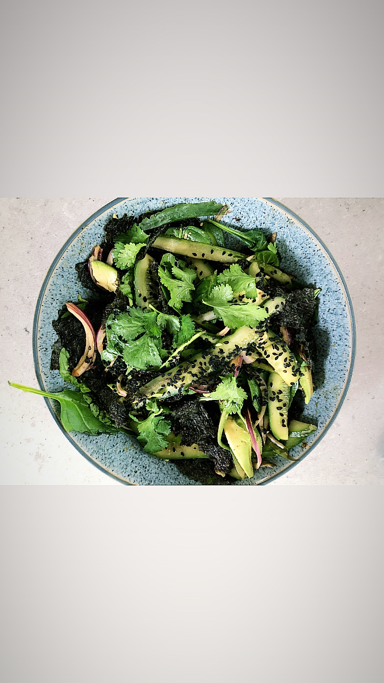 - Peel and thinly slice the avocado. Finely slice the red onion and cucumber (leave the cucumber skins, food waste sucks and their skin is packed wth nutrients!) Tear the seaweed into strips and add to a bowl with spinach and coriander.