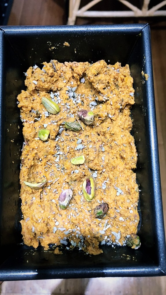 - Add the wet ingredients to your bowl of dry ones and blend to form your dough. From here you can scoop it into a bread tin, top with a couple pistachios, oregano and place in the oven to bake for 20-25 minutes. Check by carefully inserting a skewer into the centre, once it comes out clean, you know the bread is cooked!