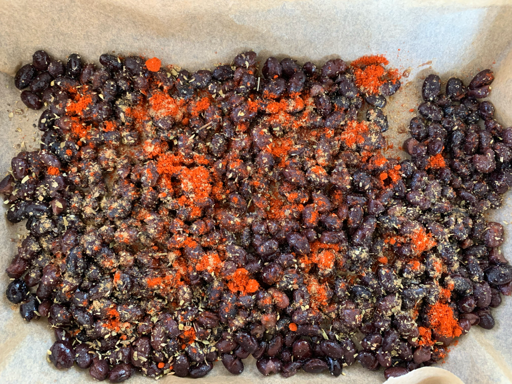 - Place the pumpkin in first as this will take the longest (around 25-30 minutes) with the capsicum on the same tray. The capsicum will be removed after 10 minutes. While this is cooking, line a second tray with baking paper and spread the tin of black beans evenly on the tray. Dust with the smoked paprika, cumin, coriander and oregano. Place them in the oven next for 10-15 minutes, tossing half way through.