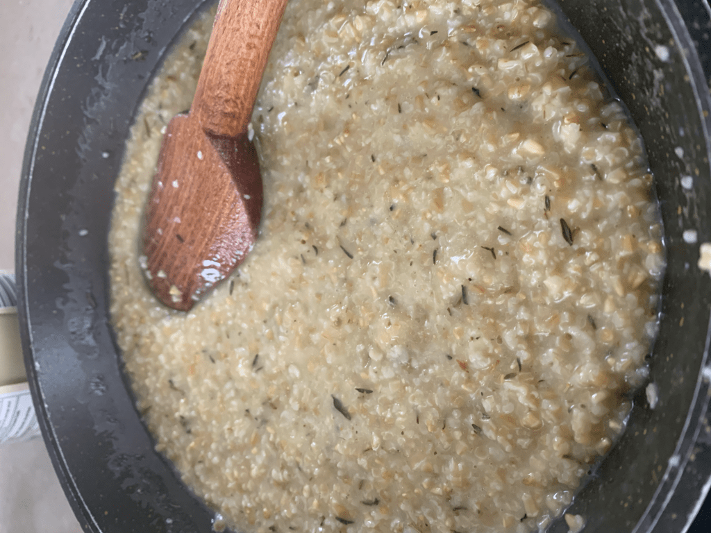 - Get your Steel cut oats going on a medium to high heat with 2 cups hot water until bubbling away, then reduce to medium low. Add your pinch of salt, thyme and the vegetable stock.