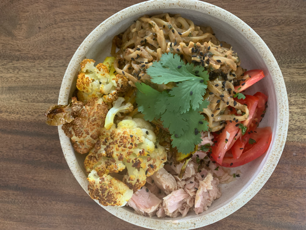 To the left you can see I added some roasted cauliflower, sliced tomato and a humble tin of tuna to turn it into a meal. These additions are not included in the above macro nutritional information. Yes, it could absolutely be turned into a salad, the noodles taste great once they have gone cold so stir in your protein source and vegetables if that is what you are craving.