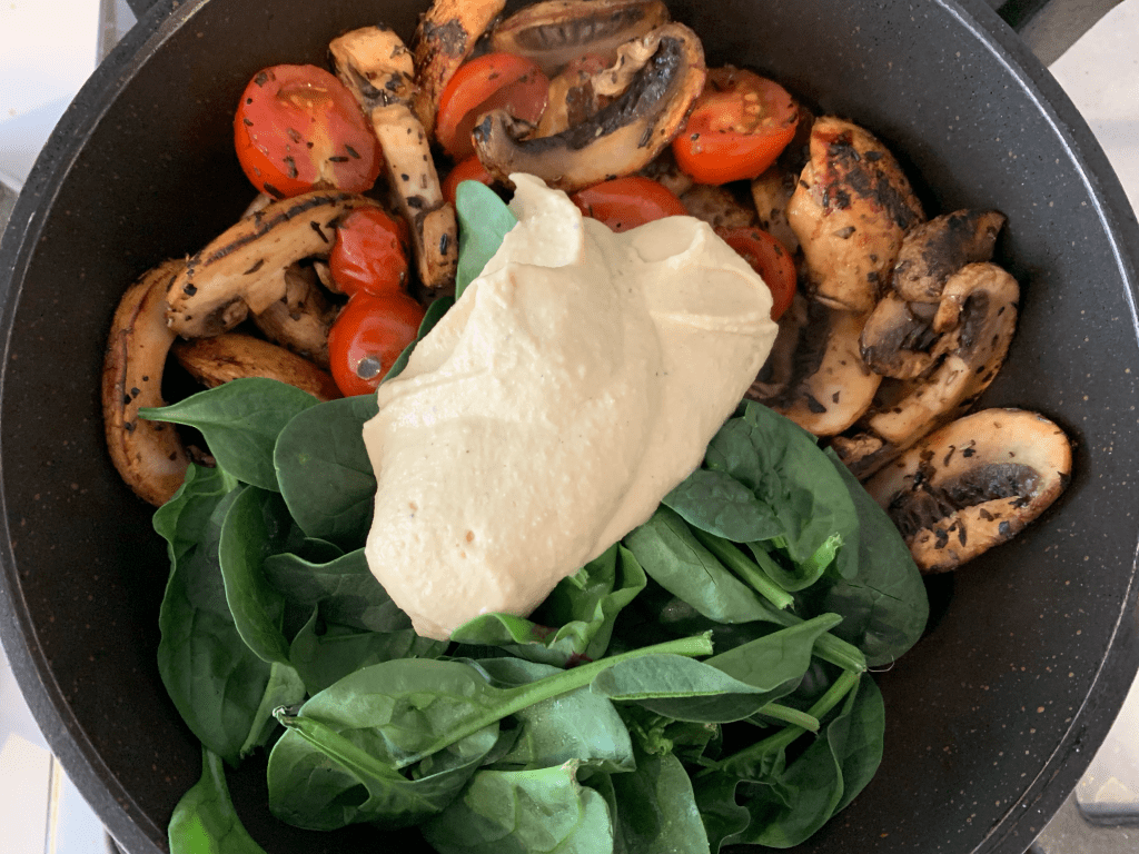 - After about 3 minutes, once the tomatoes have soften and browned a little, turn to a low heat, add a handful of spinach and the 1/3 cup of hummus.
