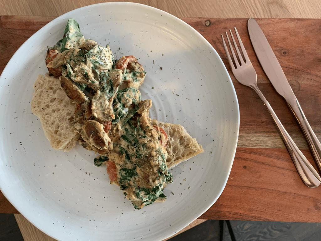- Pop your sourdough slice or roll down to toast to your liking while the veg mixture is combined and warmed in the pan.
