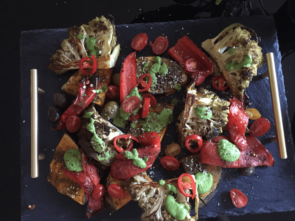 - Lunch: Smoked salmon over a bounty of fresh cut, salady vegetables and a scoop of hummus