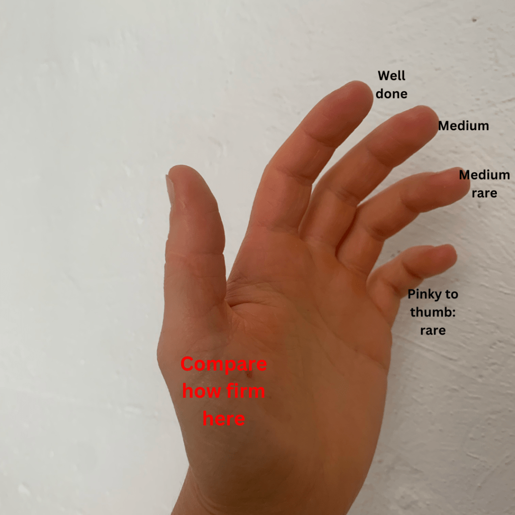 So while touching pinky to thumb, check how firm the pad under your thumb is, if your steak is the same firmness you know your steak is close to rare etc.