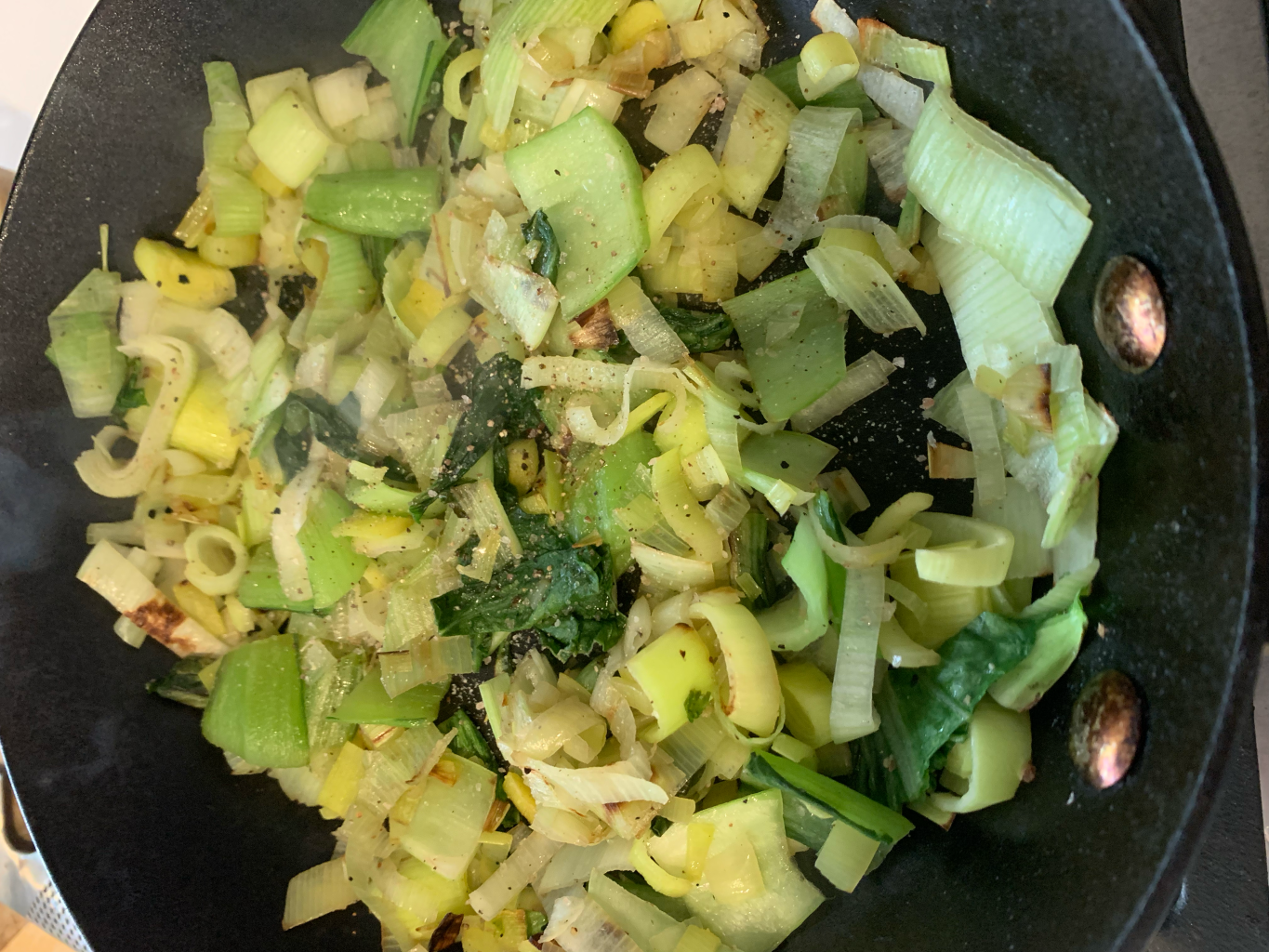 - Slice leak and boy choy into inch-ish thick pieces and allow your knob of butter to melt in the pan over a low heat. Add the vegetables, dash of salt and pepper and stir for between 8-10 minutes or until softened and sweetened to your own liking.