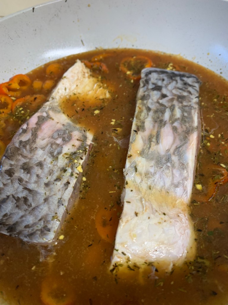 Once bubbling away merrily, add the fish fillets and place a lid atop. These will be cooked through in 6-8 minutes to watch them and intervene when necessary. They don’t really need to be turned if covered in enough of the brothy mixture.