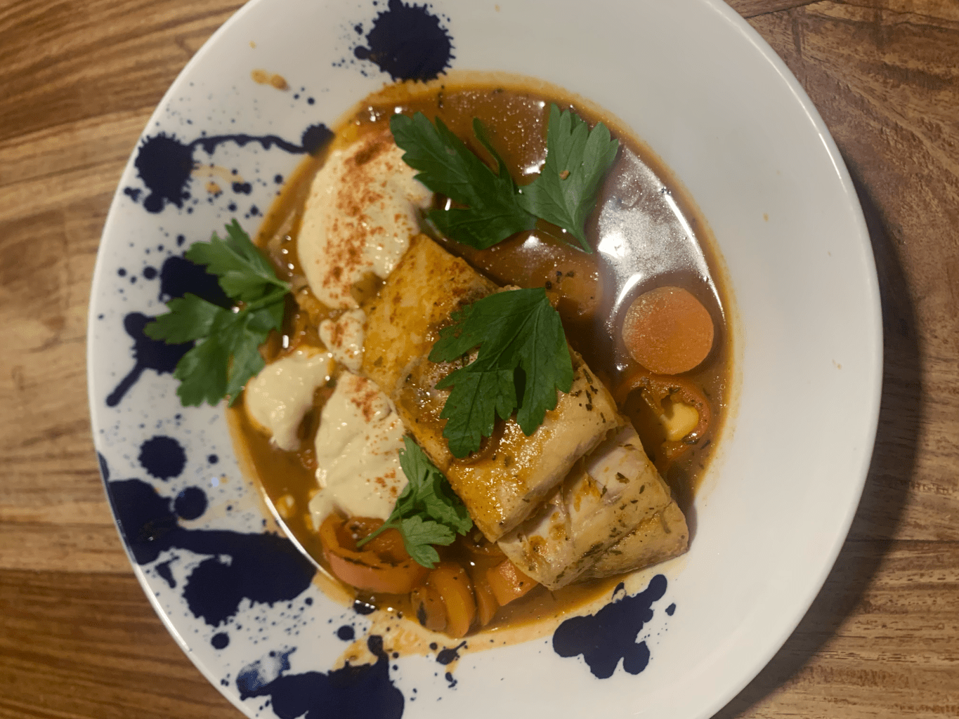 Once cooked to your liking, spoon the sauce into bowls along with equal portions of fish and vegetables. If using hummus, dollop onto bowl as well and enjoy!