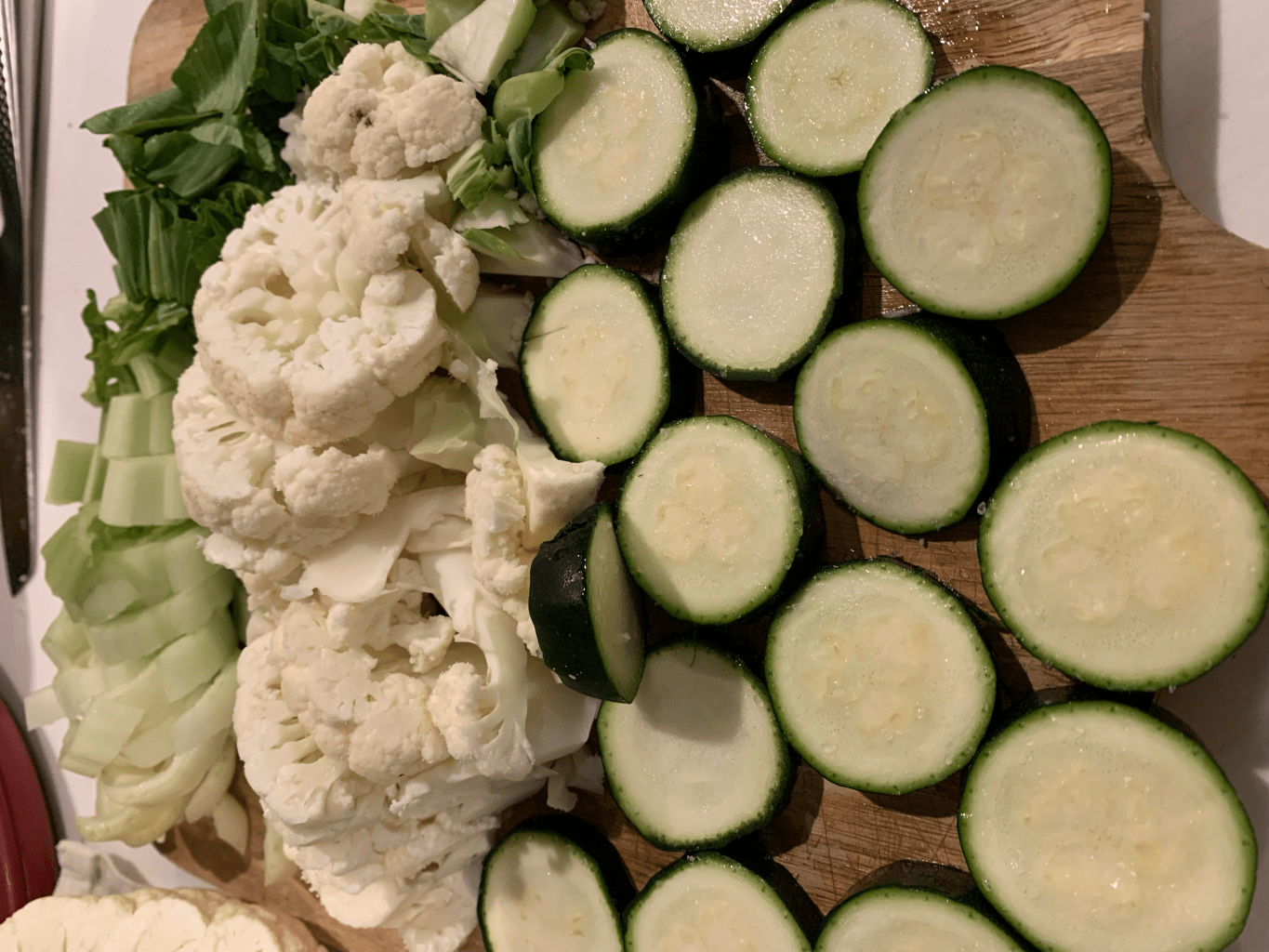 Sauté your zucchini and cauliflower on gentle heat for 3 minutes, stirring frequently. Pour hot water and all the rest of the ingredients but for the salmon and bok choy into your pan.