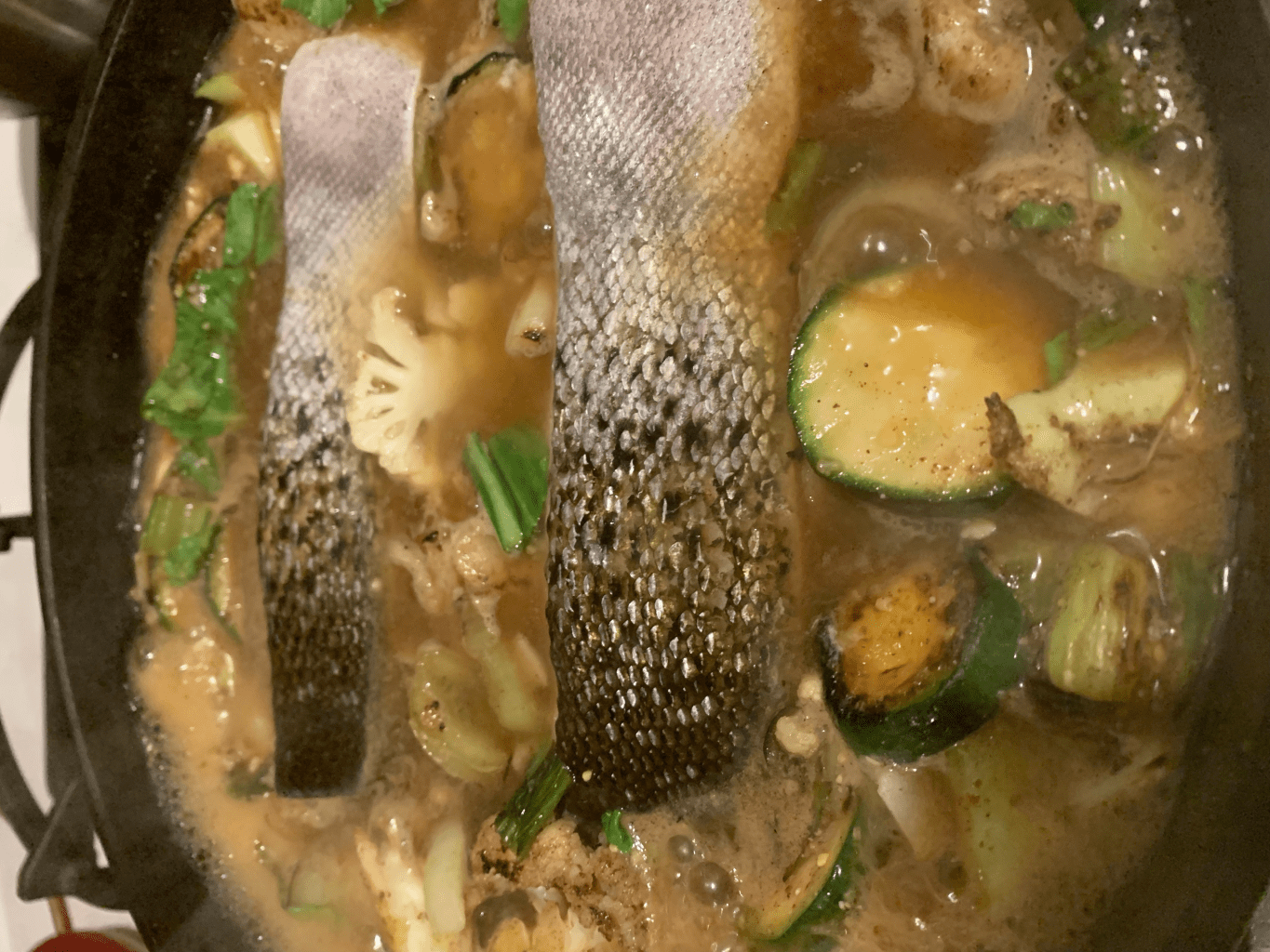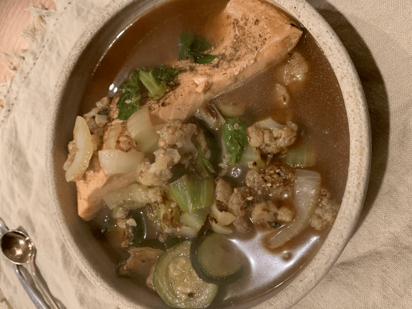Turn the heat to high (it should be just bubbling) and place the salmon fillet into the brothy wonder mixture. Place your lid on the pot and watch it doesn’t boil over, reducing the heat if need be. After 4 minutes, add the bok choy and allow to bubble away another 3-4 minutes, depending how well cooked you like your salmon.